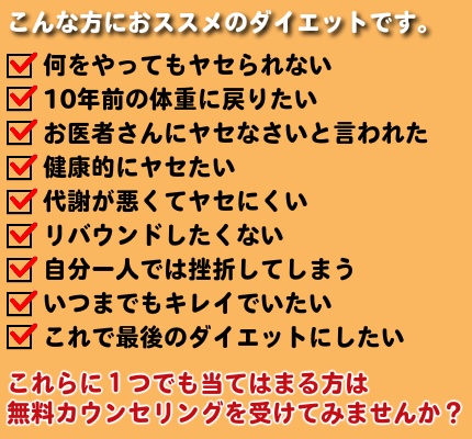 あなたがヤセてリバウンドしなくなるまで徹底サポートいたします。